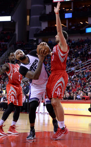 Sacramento Kings forward DeMarcus Cousins (15) tries to shoot against Houston Rockets forward Ryan Anderson (3) during the second half of an NBA basketball game Tuesday, Jan. 31, 2017, in Houston. (AP Photo/George Bridges)
