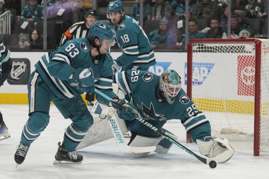 The San Jose Sharks goaltender MacKenzie Blackwood (29) looks on as Shark defenseman Nikita Okhotiuk (83) reaches out for the puck in the second period at SAP Center in San Jose on Tue Jan 30, 2024 (AP News photo)