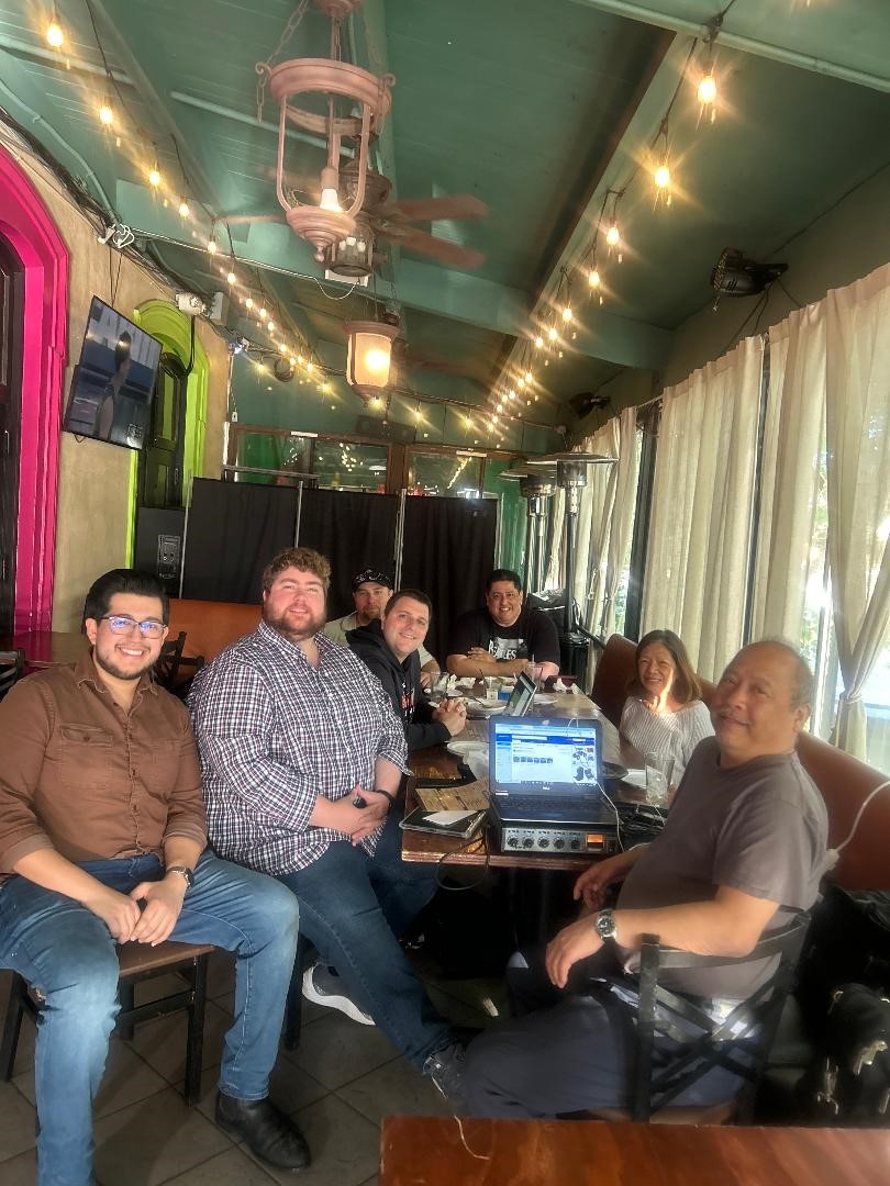 La Terraza Mexican Cuisine Old Sacramento cast: left to right Diego Mirazo( La Terraza owner), Jeremiah Salmonson (host & Sacramento A’s beat writer), Vince Cestone (MLB analyst), Stephen Ruderman (MLB reporter), Mauricio Segura (A’s beat writer), Daisy Amaya (advertising) and Leonard Wong (producer) photo by Trinity-(La Terraza server)