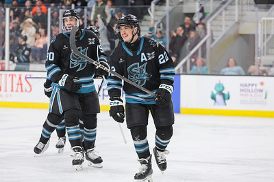 San Jose (23-14-2-3-51 points) drew first blood early in the second period. A shot attempt by Ethan Cardwell was blocked by Onyebuchi. The puck pinballed in a sea of traffic in front of the crease before leaking out to Thomas Bordeleau who snapped home a wrist shot past Roadrunners goalie Jackson Stauber for his eighth goal of the season at the 1:55 mark.
