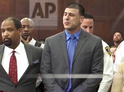 In this still image from video, Aaron Hernandez, right, listens beside defense attorney Ronald Sullivan, Friday, April 14, 2017, in court in Boston, as he is pronounced not guilty of murder in the 2012 shootings of two men in a drive-by shooting in Boston. (WHDH-TV via AP, Pool)