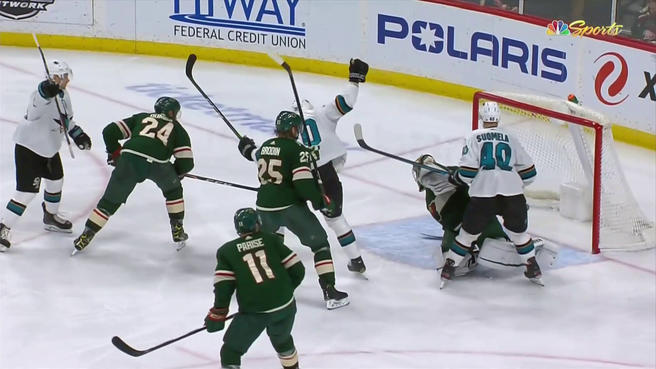 The Wild pulled Stalock from the net for the extra skater with 1:36 to go in the third. Melker Karlsson and Patrick Marleau had shots at the empty net but the Wild defense was there to prevent those goals. Karlsson and Barclay Goodrow had another chance, this time as a two-man breakaway. Goodrow gave the puck to Karlsson for the shot and Karlsson took it. Goodrow got the assist.