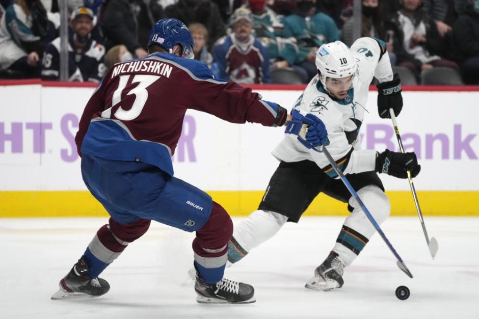 San Jose Sharks right wing Nick Merkley, right, attempts to take the puck down ice against Colorado Avalanche right wing Valeri Nichushkin at the Pepsi Center in Denver on Sat Nov 13, 2021 (AP News photo)