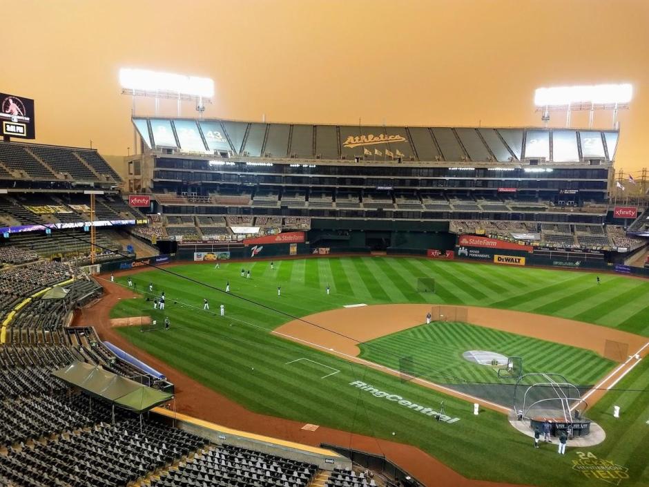 September 9, 2020 at the Oakland A’s Spanish Radio Booth prior to the game. Smoke from fires over the Coliseum (Photo by Amaury Pi-González)