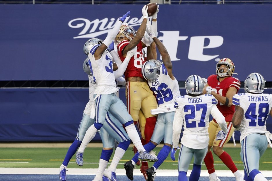 San Francisco 49ers wide receiver Kendrick Bourne (84) leaps over the Dallas Cowboys Donavon Wilson (left) and Jourdan Lewis (26) catching a Hail Mary pass in the end zone in the second half in Arlington on Sun Dec 20, 2020 (AP News photo)
