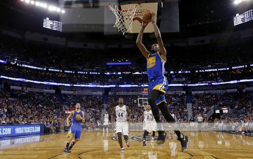 AP photo: Golden State Warriors Kevin Durant goes for the high percentage points as the Dubs chalk up their first win of 2016-17 against the New Orleans Pelicans Friday night