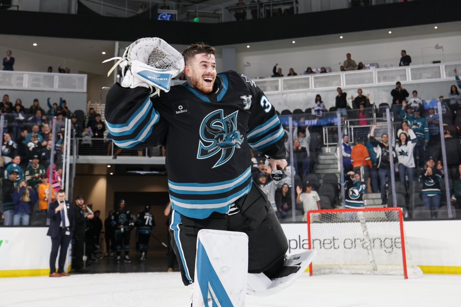 San Jose Barracuda goaltender Yaroslav Askarov (30) holds his glove up to his ear to indicate “I can’t hear you” as he gets the love from Barracuda fans at Tech CU in San Jose after shutting out the Iowa Wild on Sat Oct 19, 2024 (San Jose Barracuda X photo)