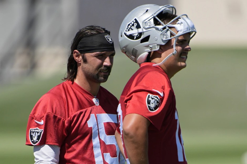 Las Vegas Raider quarterbacks Gardner Minshew (15) and Aidan O’Connell (right) at practice on Jun 4, 2024 in Henderson NV (AP News photo)