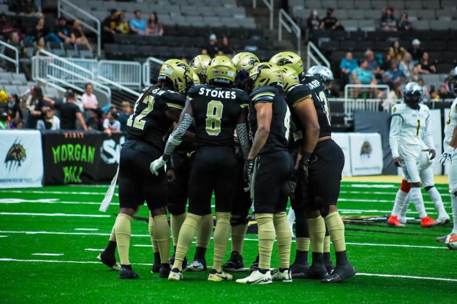 Bay Area Panthers in huddle against the San Diego Strike Force at SAP Center in San Jose on Sat Apr 20, 2024 (photo by Lauren Smith)