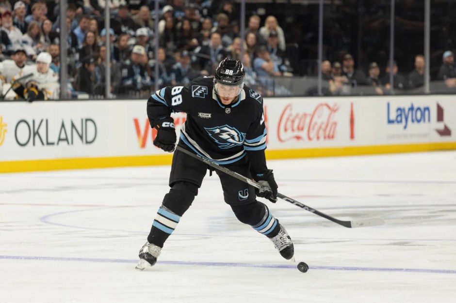 At 3:30 of the first period, Boston’s Elias Lindholm was whistled for hooking against Dylan Guenther to put Utah on the power play. Nearly a minute later, Mammoth captain Clayton Keller found forward Nick Schmaltz in front of the net whose one-timer hit linemate Logan Cooley squarely in the back on the numbers, bouncing over his left shoulder and over the head of Bruins netminder Joonas Korpisalo, falling cleanly into the net to open the scoring.