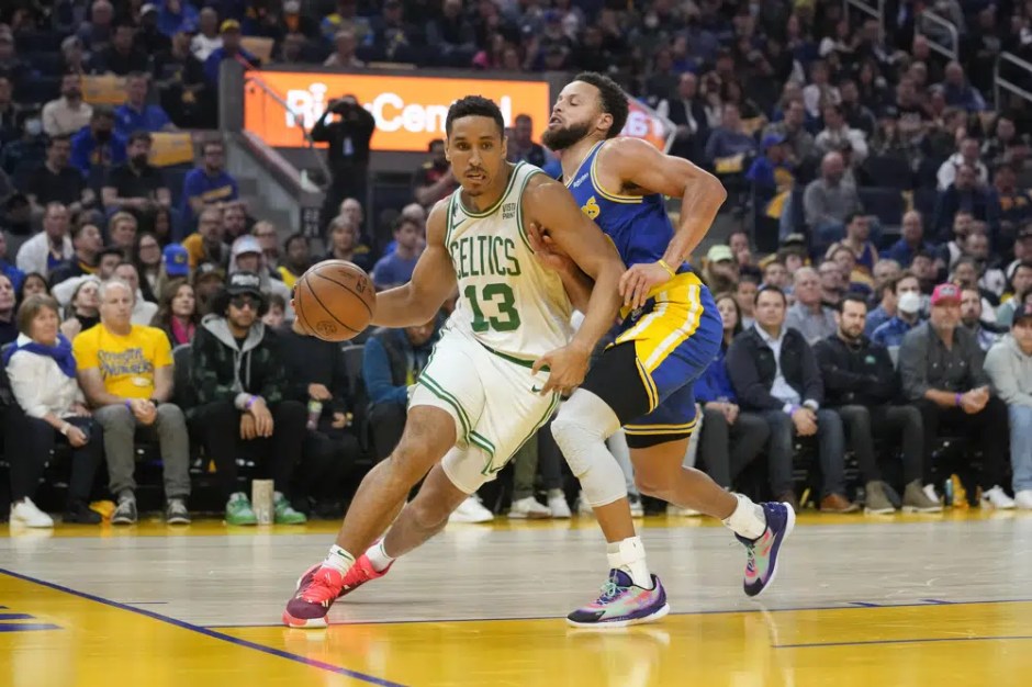 Boston Celtics guard Malcolm Brogdon (13) drives to the basket against Golden State Warriors guard Stephen Curry during the first half at the Chase Center in San Francisco on Sat Dec 10, 2022 (AP News photo)