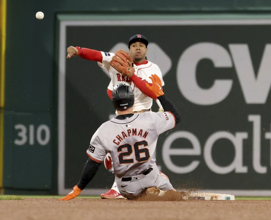 With the game now tied 1-1, Winckowski pitched a 1-2-3 inning. Harrison ran into trouble again in the bottom of the fourth after giving up a one-out double to Ceddanne Rafaela. Harrison struck out Zack Short looking, and Jarren Duran hit a line drive up the middle into center field that seemed destined to fall and give the Red Sox the lead, but center-fielder Jung-hoo Lee dove and made a spectacular catch to end the inning and keep the game tied.