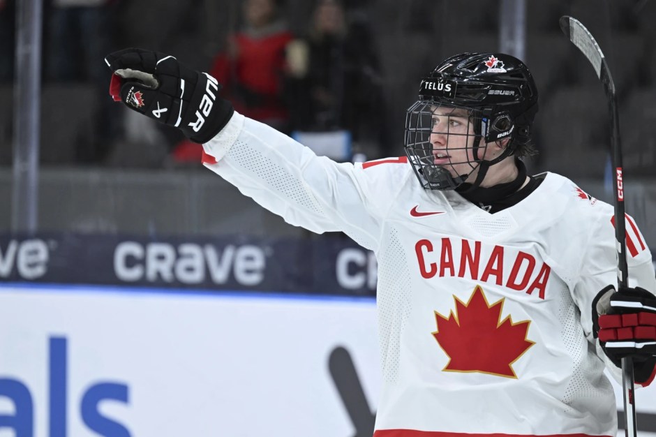Team Canada Macklin Celebrini scores against Team Latvia in the IIHF World Junior Championship group in Gothenburg Sweden Wed Dec 27, 2023. Celebrini is the NHL No.1 draft choice in the 2024 NHL Draft. (TT News Agency photo via AP)