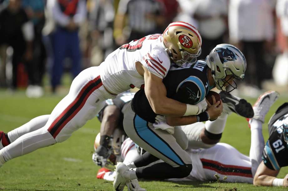 photo from sfgate.com: Carolina Panthers quarterback Kyle Allen is sacked by San Francisco 49ers defensive end Nick Bosa during the first half of an NFL football game in Santa Clara, Calif., Sunday, Oct. 27, 2019.