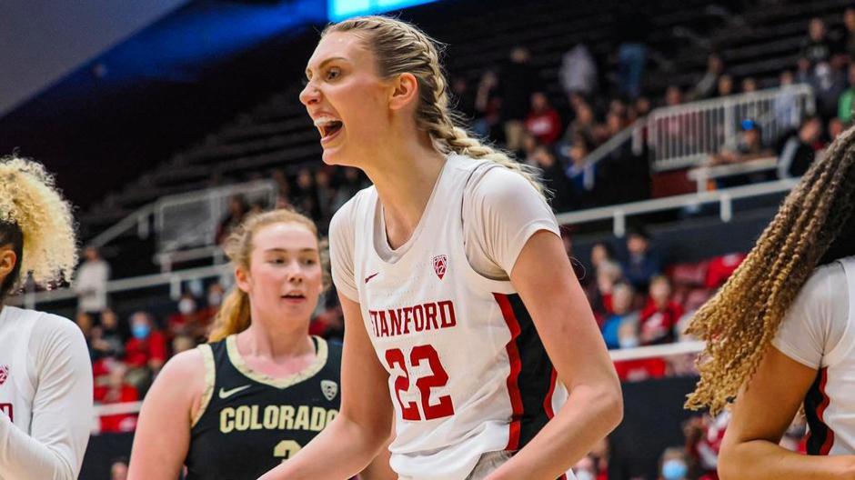Stanford Cardinal forward Cameron Brink (22) is fired up against the Colorado Buffaloes at Maples Pavilion in Palo Alto on Sun Jan 22, 2023 (photo grab from Stanford Cardinal)