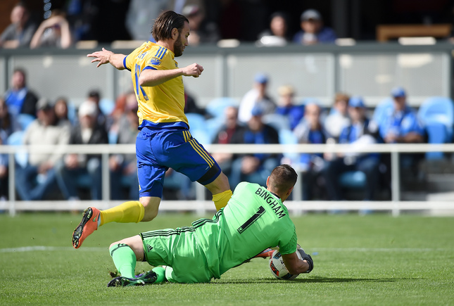 The best opportunity for the Quakes came at the 35th minute when Danny Hoesen received a ball from 12 yards out and centered a ball off the hands of Bono that trickled out to the middle of box where Eriksson had a wide-open net to shoot at. His attempt was deflected over the net on a desperation tackle by Justin Morrow.