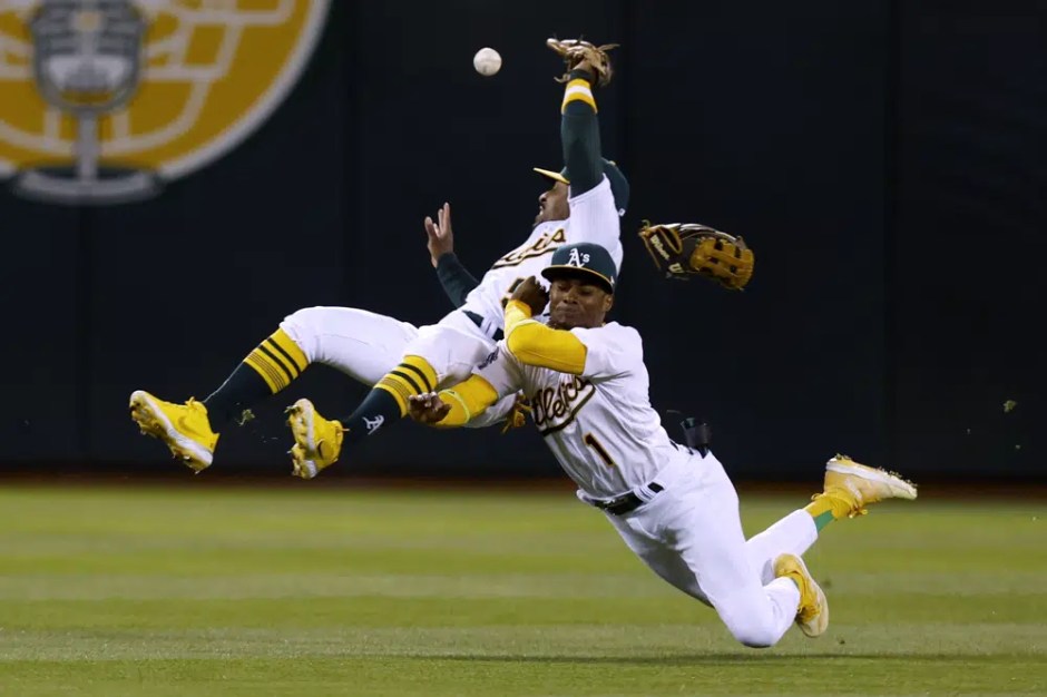 Oakland Athletics’ Ramon Laureano hits a two-run home run during the fifth inning of a baseball game against the Cleveland Guardians at the Oakland Coliseum on Monday, April 3, 2023 (AP News photo)