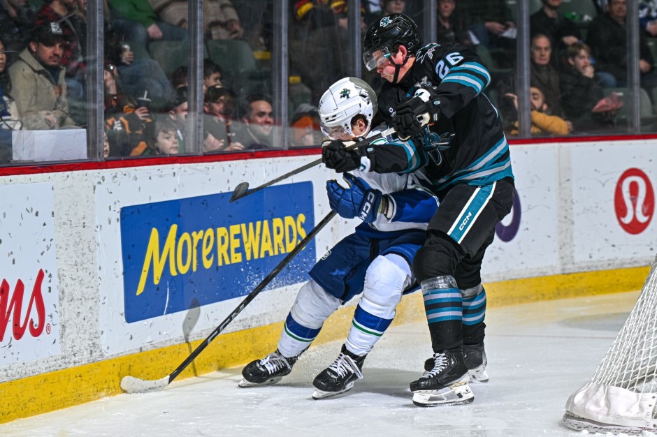 San Jose Barracuda defenseman Luca Cagnoni (42) pursues the Colorado Eagles forward Oskar Olausson (4) who tries to get the puck past San Jose goaltender Yaroslav Askarov (30) at Blue CFU Arena in Loveland CO on Sat Apr 5, 2025 (AP News photo)