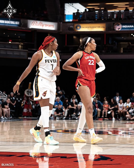 Indianapolis Fever forward Aliyah Boston (7) and Las Vegas Aces center A’ja Wilson (22) wait to set up for the next play at Gainbridge Fieldhouse in Indianapolis on Sun Jun 4, 2023 (@LVAces photo)