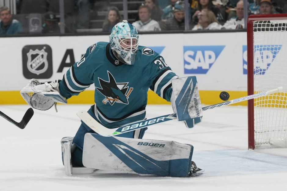 San Jose Sharks goaltender Yaroslav Askarov (30) makes a save against the Pittsburgh Penguins in the second period at SAP Center in San Jose on Mon Jan 27, 2025. Askarov is out for three weeks due to a lower body injury (AP News photo)