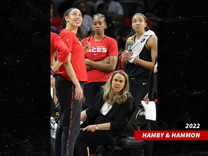 Former Las Vegas Aces Dearica Hamby left, looking up and smiling and below seated on the right Aces head coach Becky Hammon who starts her suspension on opening night Sat May 20 when the Aces are scheduled to face the Seattle Storm at Climate Pledge Arena in Seattle ( 2022 photo from TMZ file)