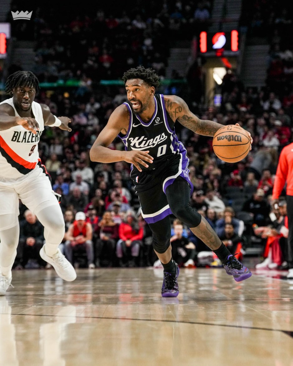 Sacramento Kings Molik Monk (0) drives the lane with the Portland Trail Blazers Jerami Grant (9) in pursuit in NBA pre season action at the Moda Center in Portland on Sac Oct 11, 2025 (Sacramento Kings X photo)