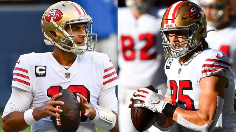 San Francisco 49ers Nick Bosa points to his MAGA hat standing behind sideline reporter Melissa Stark (left) and quarterback Brock Purdy (13) after the Dallas Cowboys-49ers game on Sun Oct 27, 2024 at Levi Stadium in Santa Clara (NBC Sunday Night Football still)