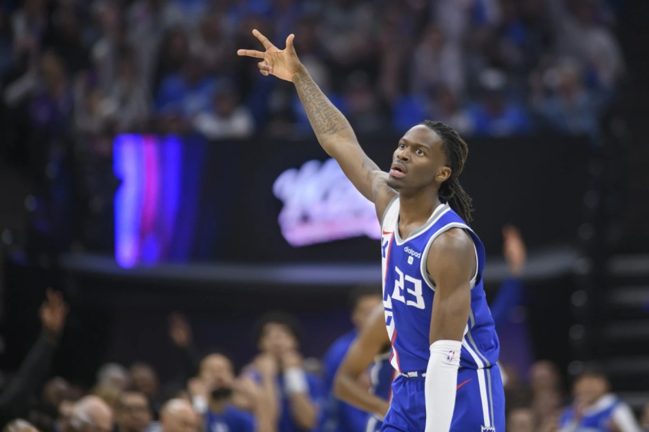 The Sacramento Kings guard Keon Ellis (23) shown after making a three point shot in the first half against the Portland Trail Blazers at Golden 1 Center in Sacramento on Sun Apr 14, 2024 (AP News photo)