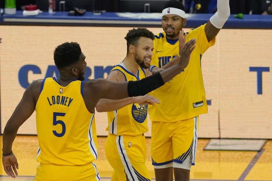 Lots of happy Golden State Warriors Kevon Looney (5), Stephen Curry (30) and Kent Bazemore standing behind Curry. Curry finished the night with 30 points against the Sacramento Kings on Mon Jan 4, 2021 at Chase Center in San Francisco (AP News photo)