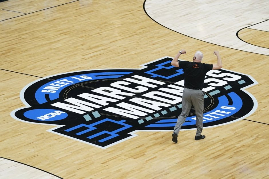 Oregon State Beavers head coach Wayne Trinkle celebrates the Beaver’s victory over the Loyola Chicago Ramblers on Sat Mar 27, 2021 at Indianapolis (AP News photo)
