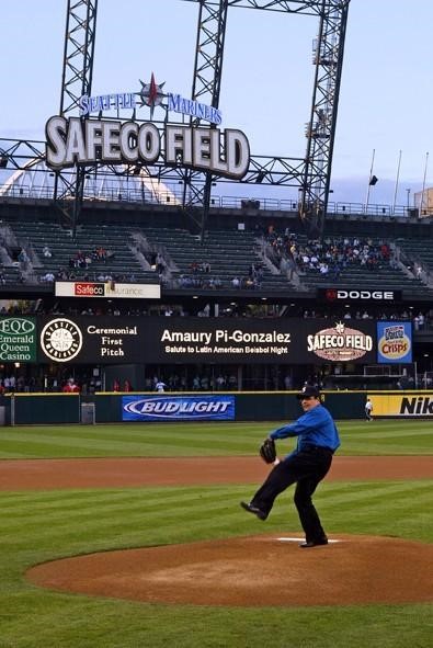 Amaury Pi-González throws First Pitch in Seattle during Ichiro years. (Photo from the author)