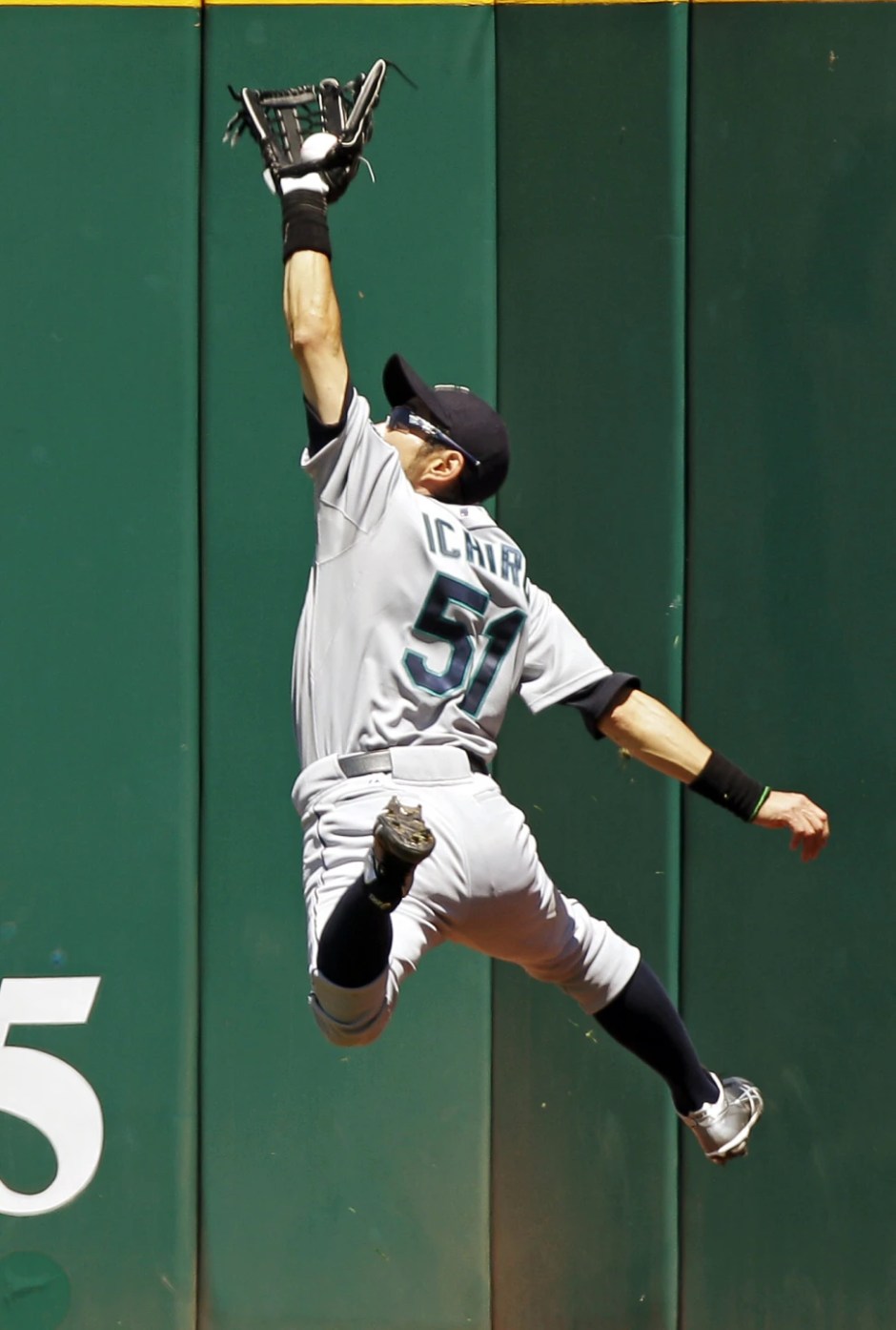 The Seattle Mariners right fielder Ichiro Suzuki makes a leaping catch to rob the Cleveland Guardians Carlos Santana of a hit in the bottom of the fourth inning at Progressive Field in Cleveland on Thu May 17, 2012. Ichiro was voted into the MLB Cooperstown Hall of Fame on Tue Jan 21, 2025 (AP News photo)