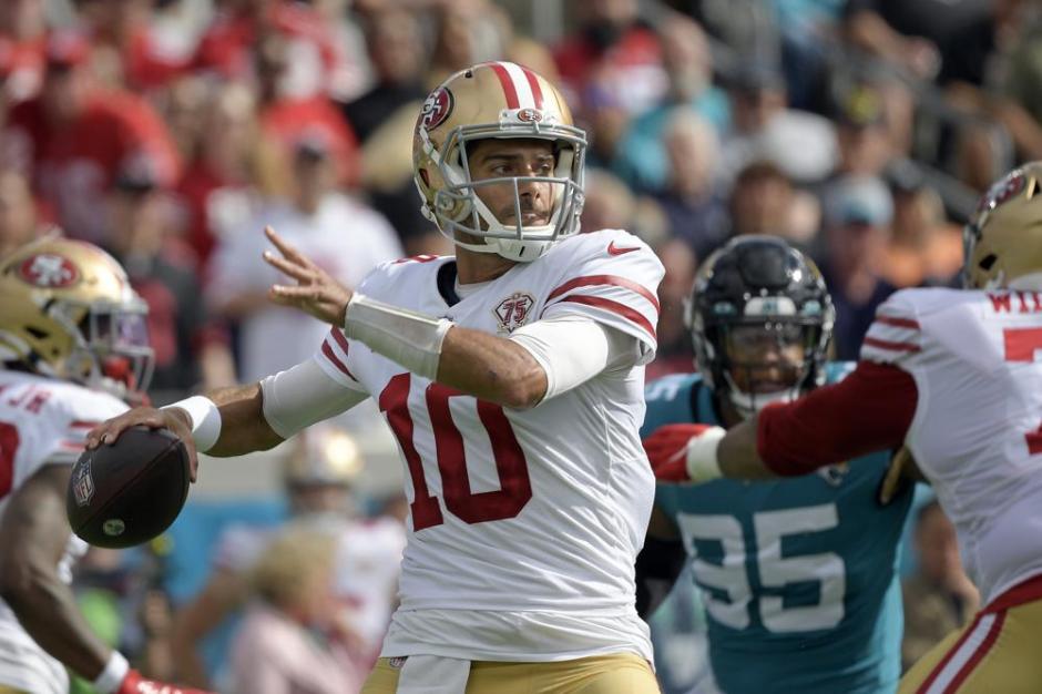 The San Francisco 49ers quarterback Jimmy Garoppolo (10) throws against the Jacksonville Jaguars in the first half of Sun Nov 21, 2021 game at Jacksonville (AP News photo)