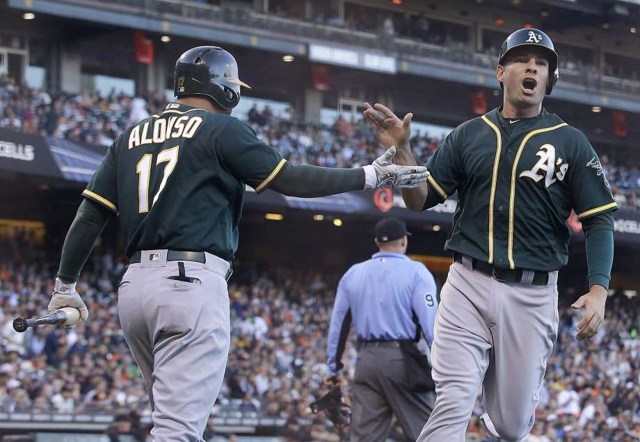 AP photo: The Oakland A’s Danny Valencia is greeted at home plate by Yonder Alfonso scoring one of the A’s eight runs on Monday night at AT&T Park