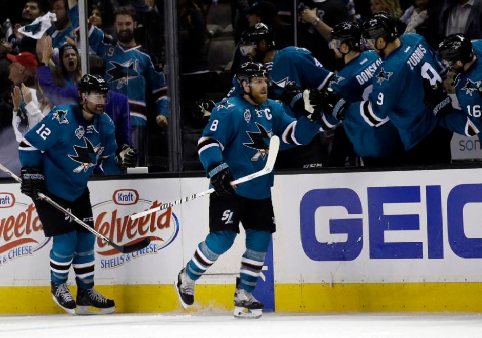 AP photo: San Jose Sharks Joe Pavelski and teammates enjoy the jubilation after Pavelski’s goal against the Nashville Predators in game five at SAP Center Saturday night