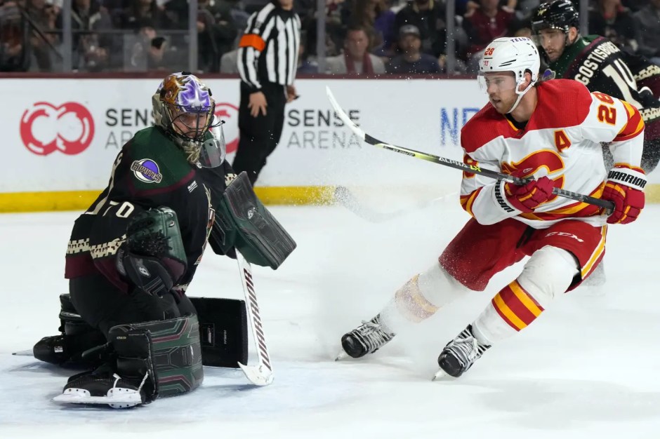 The Calgary Flames forward Elias Lindholm (28) skates up against the Arizona Coyotes goaltender Karel Vejmelka (70) at ASU in Tempe AZ on Wed Feb 20, 2023. Lindholm signed a six year deal with the Flames worth $21.9 million (AP file photo)