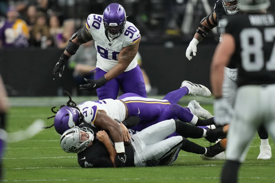 #1 Las Vegas Raiders (5-8) quarterback Aidan O’Connell was on the run all day and couldn’t get any offense going 21-32 for 171 yards had a long day trying to find someone to throw too but the Minnesota Vikings (7-6) pass rush was just too much as O’Connell’s take away from this game was seeing too much purple.