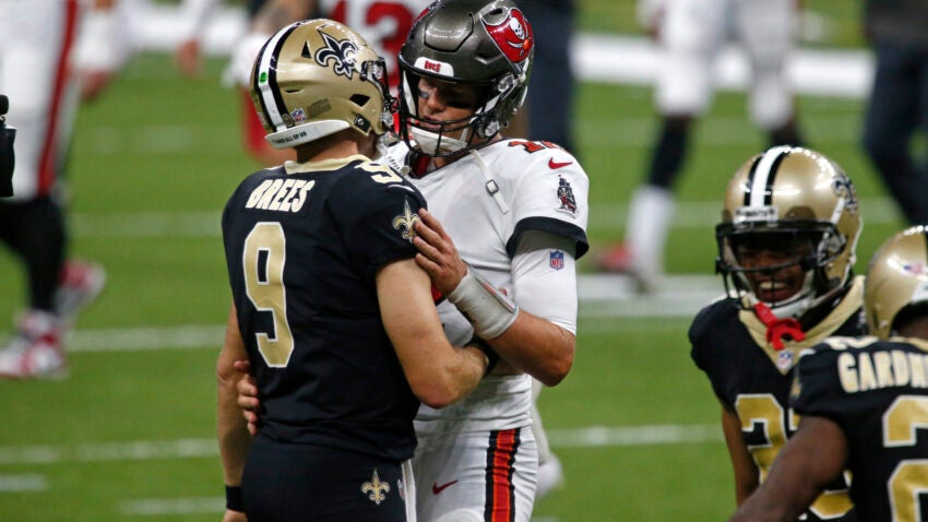 The New Orleans Saints Drew Brees (9) and the Tampa Bay Buccaneers quarterback Tom Brady (12) meet at midfield after their game last Sun Sep 13th. The Saints are in Las Vegas for the very first game in Las Vegas for the Raiders on Monday Night Football (AP News photo)