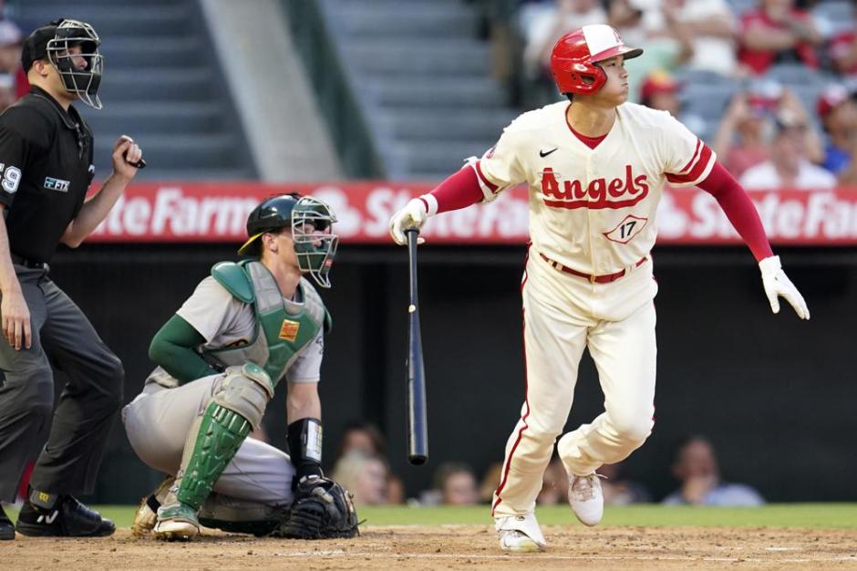 Los Angeles Angels Shohei Ohtani hits a line drive to center for an out in the bottom of the third inning against the visiting Oakland A’s at the Big A in Anaheim on Tue Aug 1, 2022 (AP News photo)