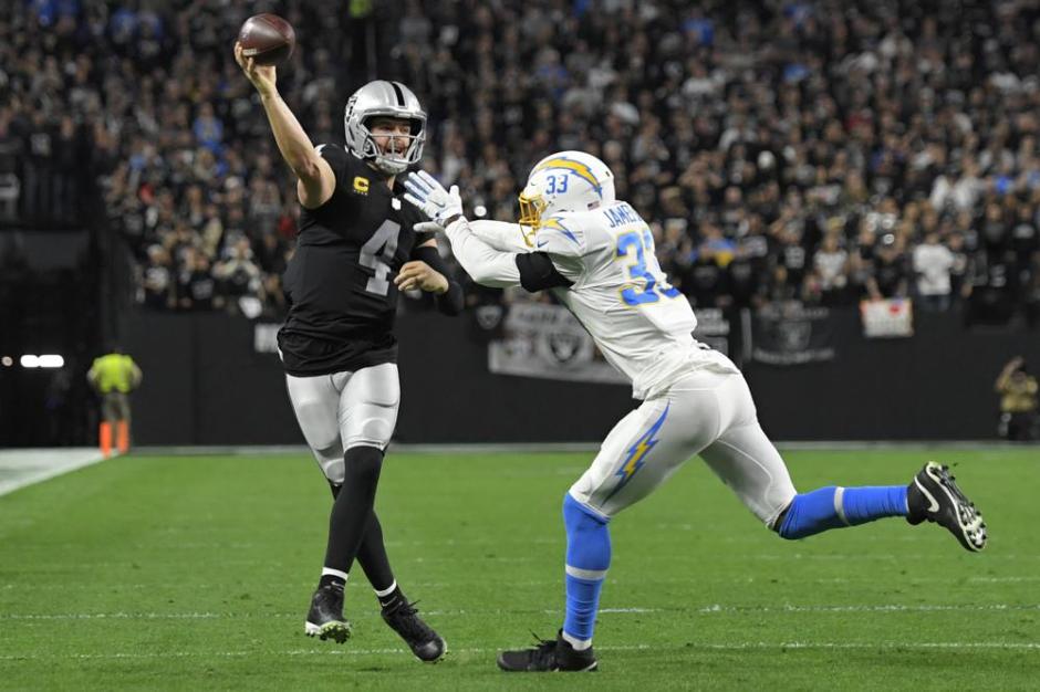 Los Angeles Chargers free safety Derwin James Jr (33) puts pressure on the Las Vegas Raiders quarterback Derek Carr (4) as he gets a pass away at Allegiant Stadium in Las Vegas on Sun Jan 9, 2022 in the final regular season game of 2021-22 (AP News photo)