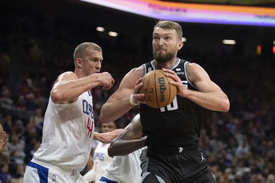 Sacramento Kings forward Domantas Sabonis (10) spins away from Los Angeles Clippers center Mason Plumlee (44) during the first quarter at Golden 1 in Sacramento on Fri Mar 3, 2023 (AP News photo)