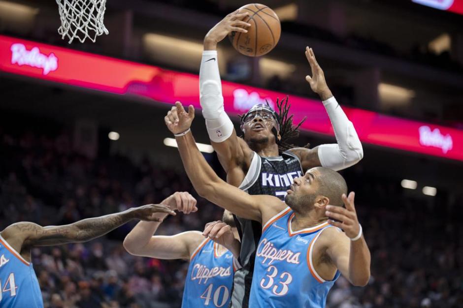 Sacramento Kings center Richaun Holmes (22) gets the rebound as the Los Angeles Clippers’ Nicolas Batum (33) and Ivica Zubac (40) defend at the Golden One Center in Sacramento on Wed Dec 22, 2021 (AP News photo)