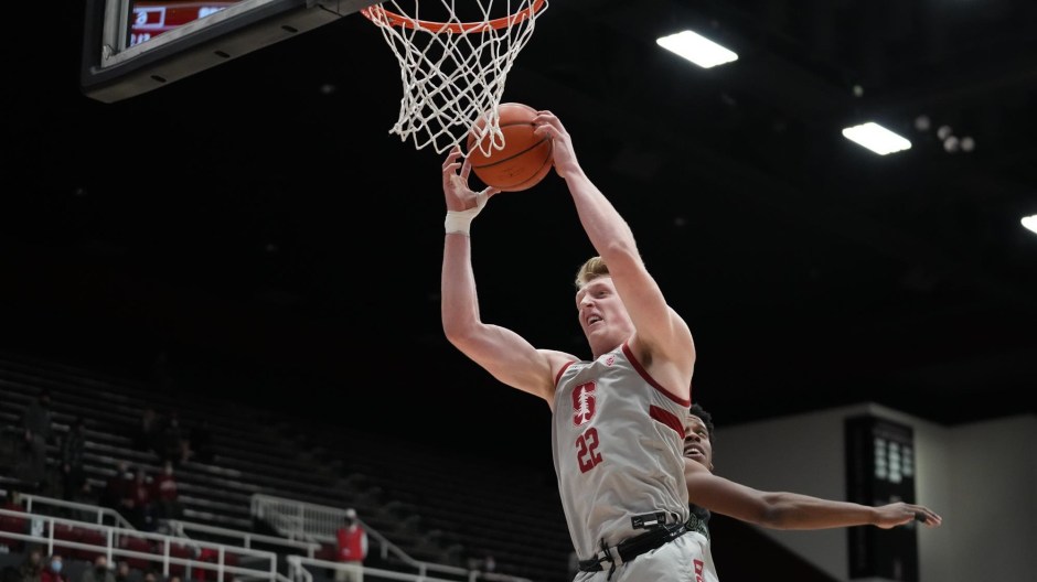 Stanford Cardinal James Keefe throws down, Keefe was second in scoring against the Loyola Chicago Ramblers Thu Dec 22, 2022 at Kaiser Permanente in Santa Cruz with 14 points (Stanford Cardinal file photo)