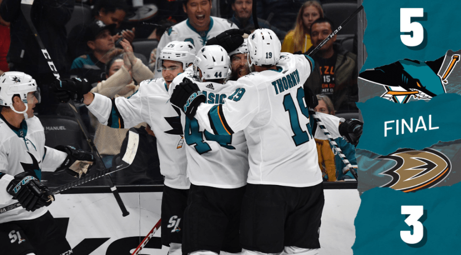 The San Jose Sharks won their fifth in a row Saturday, defeating the Anaheim Ducks 5-3 at the Honda Center. Sharks goals came from the usual suspects: Tomas Hertl (2), Evander Kane, Brent Burns and Logan Couture. Martin Jones made 29 saves for the win. Rickard Rakell, Jakob Silfverberg and Max Jones scored for Anaheim, while John Gibson made 30 saves. Tomas Hertl has now scored in five games in a row. Regrettably, he left the game late in the third after a collision.
