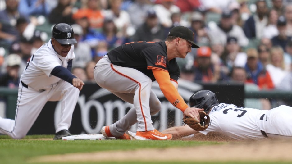 Detroit Tigers third base coach Joey Cora (left) has got a good idea that Detroit Tigers Jake Rogers (right) has got the throw and tag beat ahead of San Francisco Giants third baseman in bottom of the fifth inning at Comerica Park in Detroit on Wed May 28, 2025 (AP News photo)