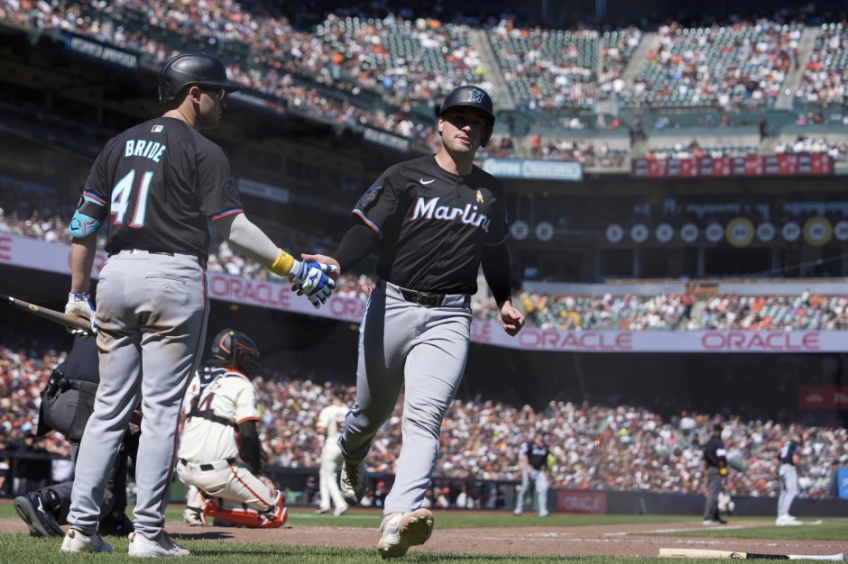 Miami Marlins Nick Fortes (right) is congratulated by teammate Jonah Bride (41) after scoring from third base on a Jesus Sanchez sacrifice fly in the top of the seventh inning at Oracle Park in San Francisco (AP News photo)