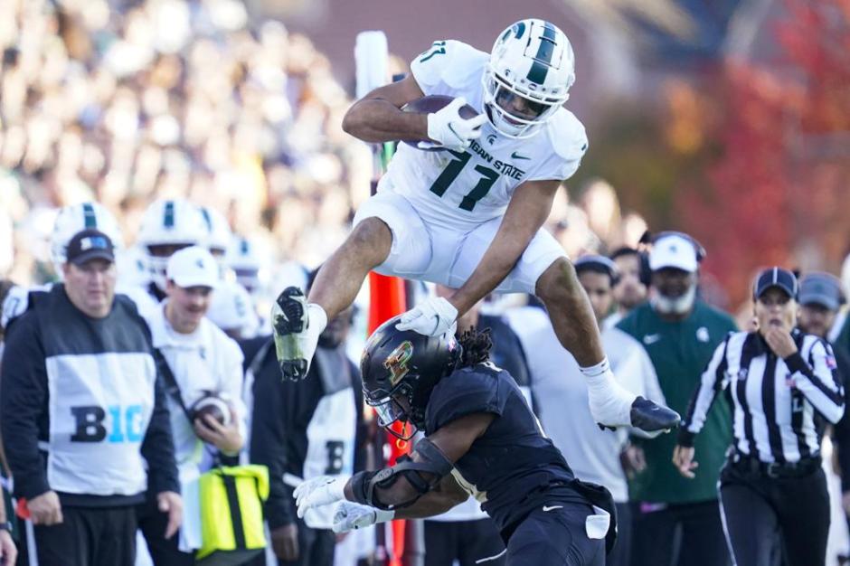 Josh Imatorbhebhe was on the receiving end of an 83-yard touchdown pass from Brandon Peters to cut the Spartans lead down to 31-17.