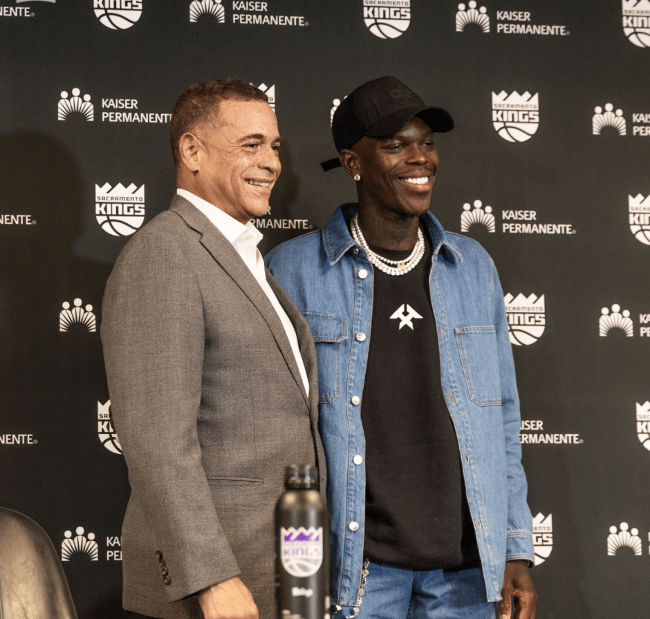 Dennis Schröder and Scott Perry at a press conference on Tuesday introducing the new Kings PG. (Photo: Sacramento Kings on X)