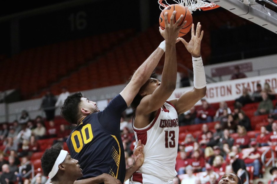 The Washington State Cougars forward Isaac Jones (13) puts up a prayer with the Cal Bears forward Fardaws Aimaq (00) putting on the pressure in the second half at Beasley Coliseum in Pullman on Thu Feb 15, 2024 (AP News photo)