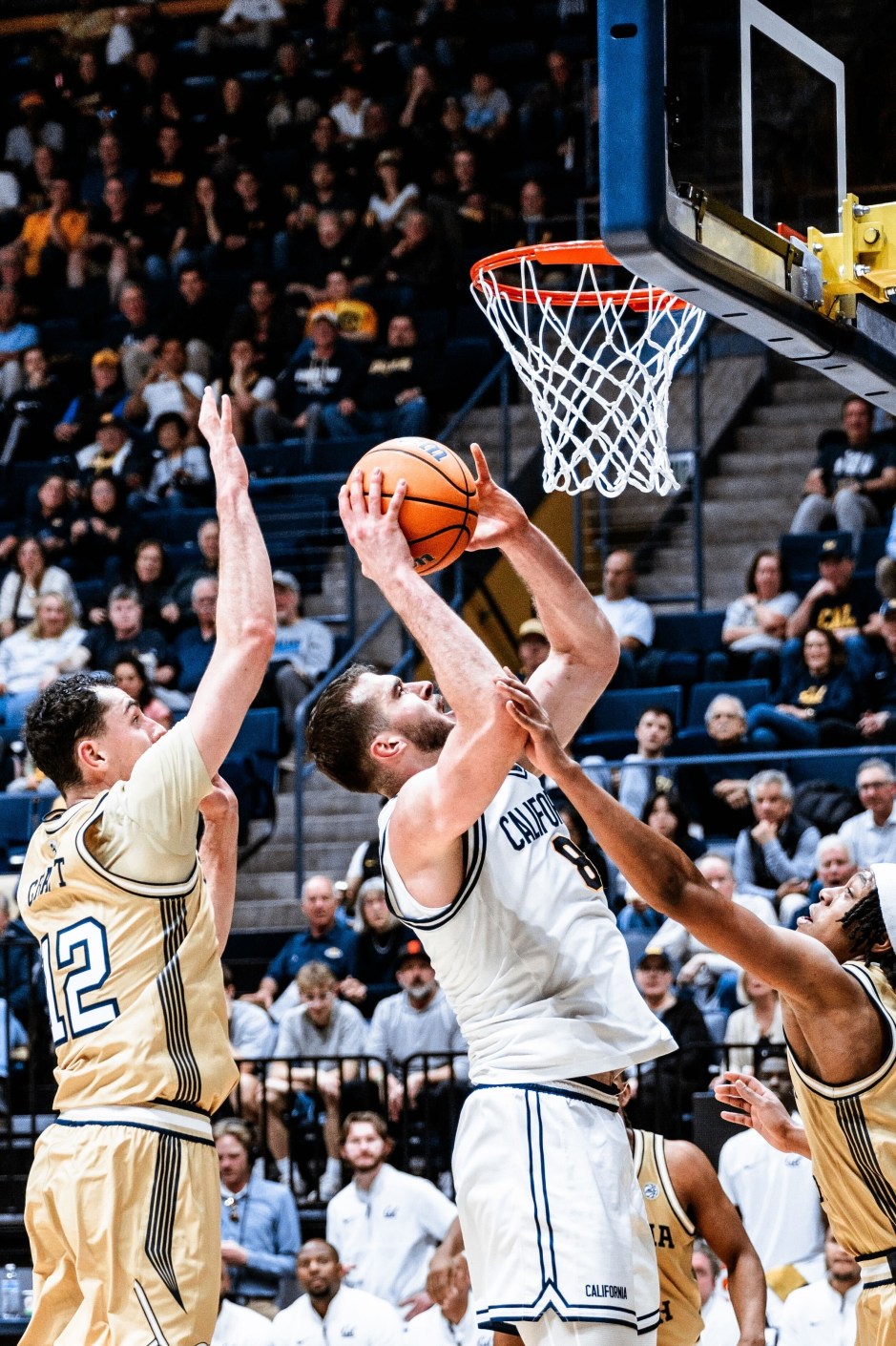 Cal Bears center Milos Ilic takes the ball to the hoop being pursued by the Georgia Tech Yellow Jackets guard Kam Craft (12) at Haas Pavilion in Berkeley on Wed Feb 4, 2026 (Cal Bears X photo)